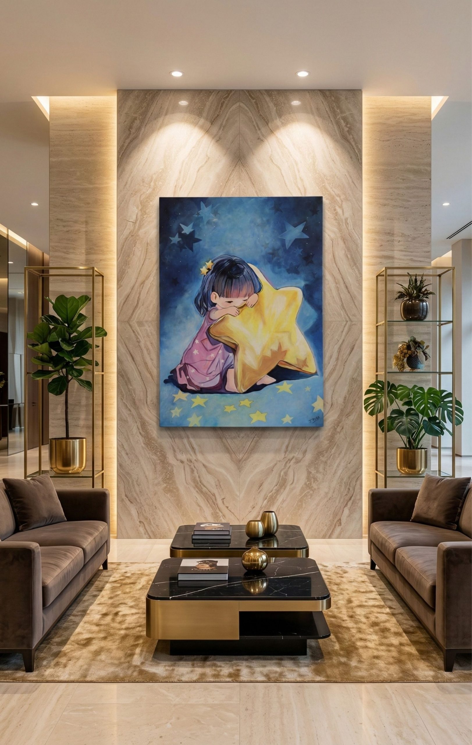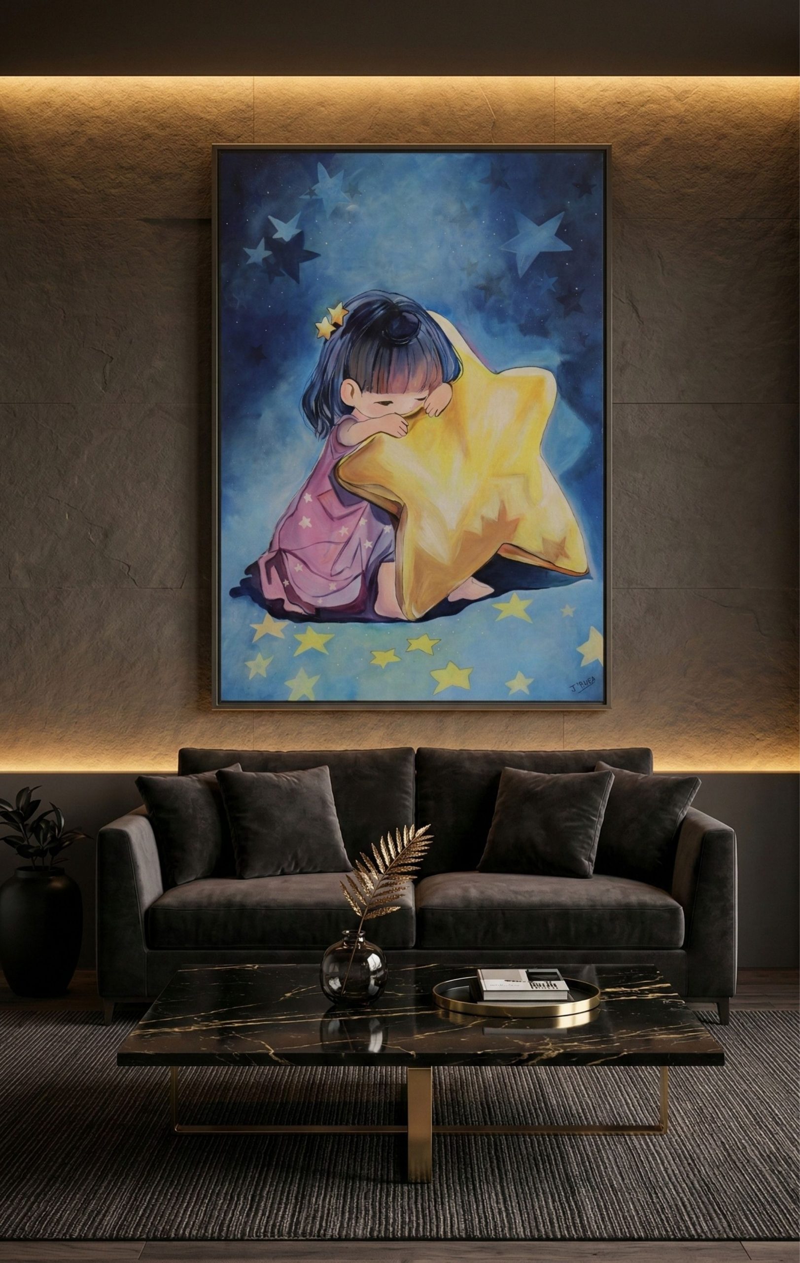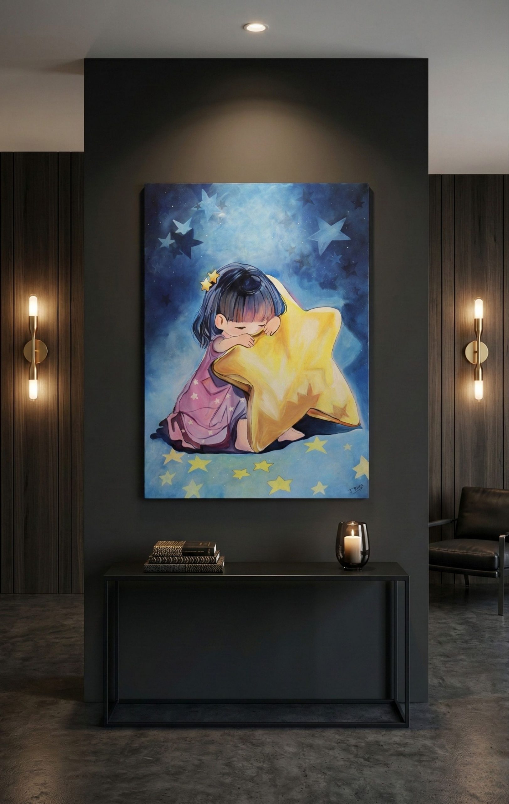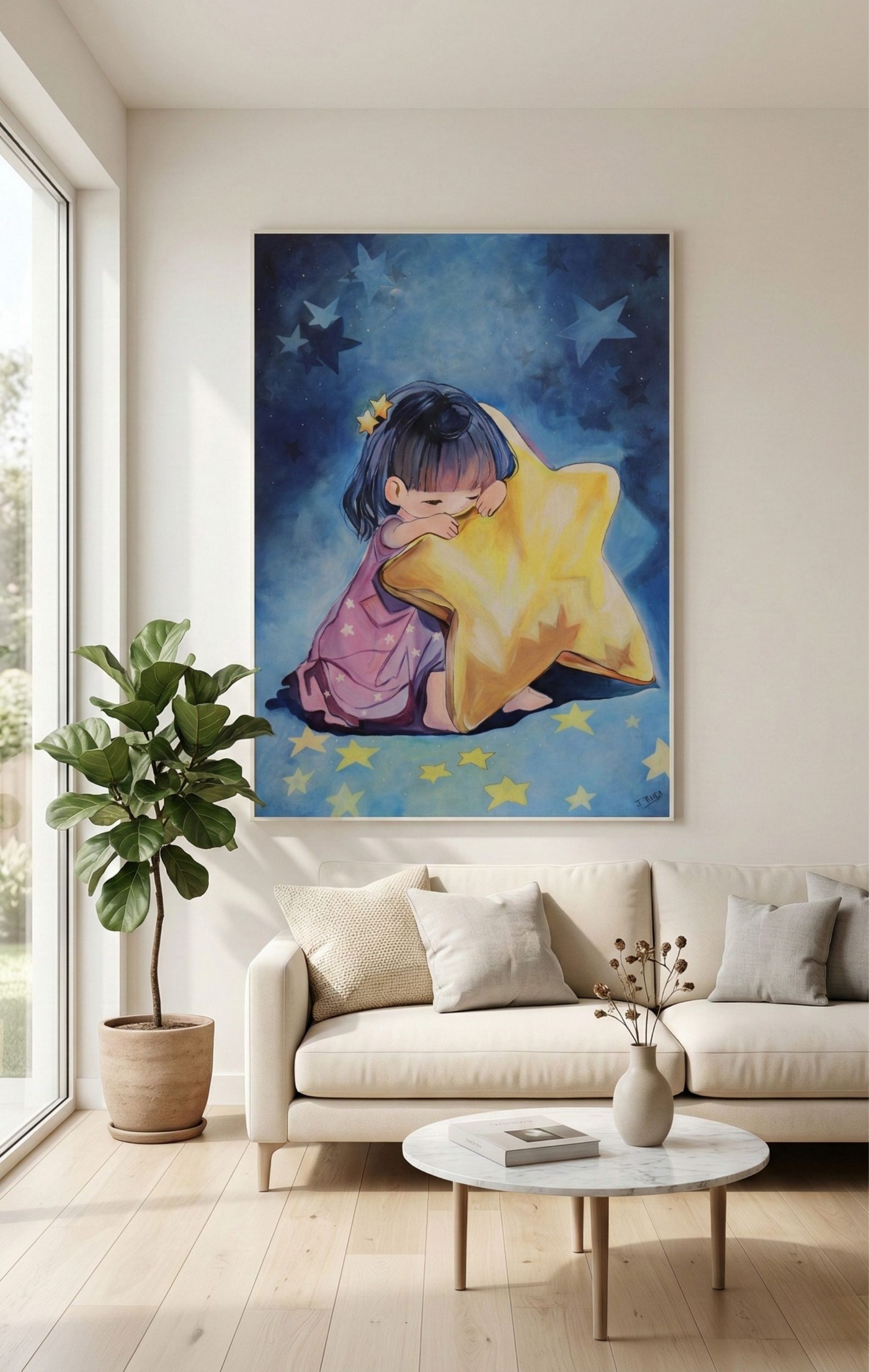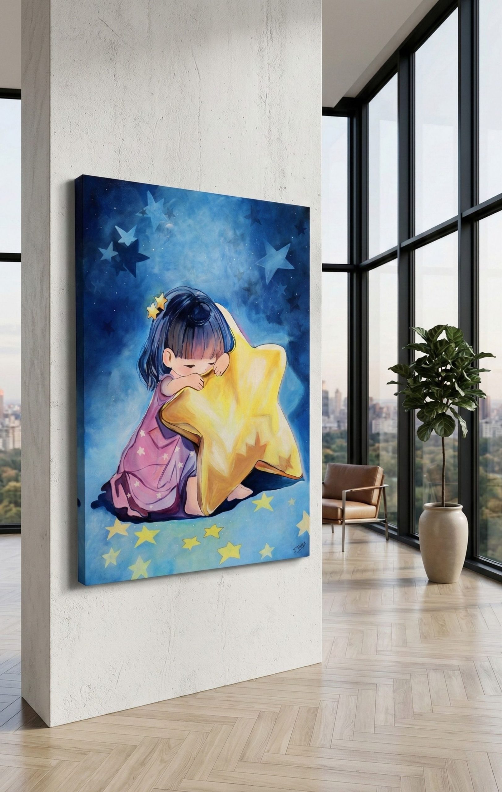 Her Favourite Star reflects the quiet strength of love that never truly leaves. A child gently holds a glowing star, symbolizing the enduring presence of someone deeply cherished. Tender and deeply moving, the painting speaks to remembrance, connection, and the light that continues to guide us.